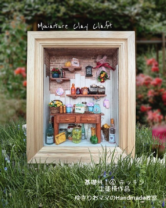 このキッチンの額で初めて家具が入ります棚の色や小物の色で雰囲気ガラッと変わってしまうので慎重にレイアウトしたくなる💕ミニボトルや、お花、本、時計等を粘土で作って小さなキッチンのドールハウスを楽しみましょう🎵